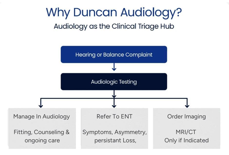 Audiology serves as the clinical triage hub for hearing and balance complaints. Comprehensive audiologic testing clarifies diagnosis, identifies urgency, and helps determine when ENT referral or imaging is truly indicated.